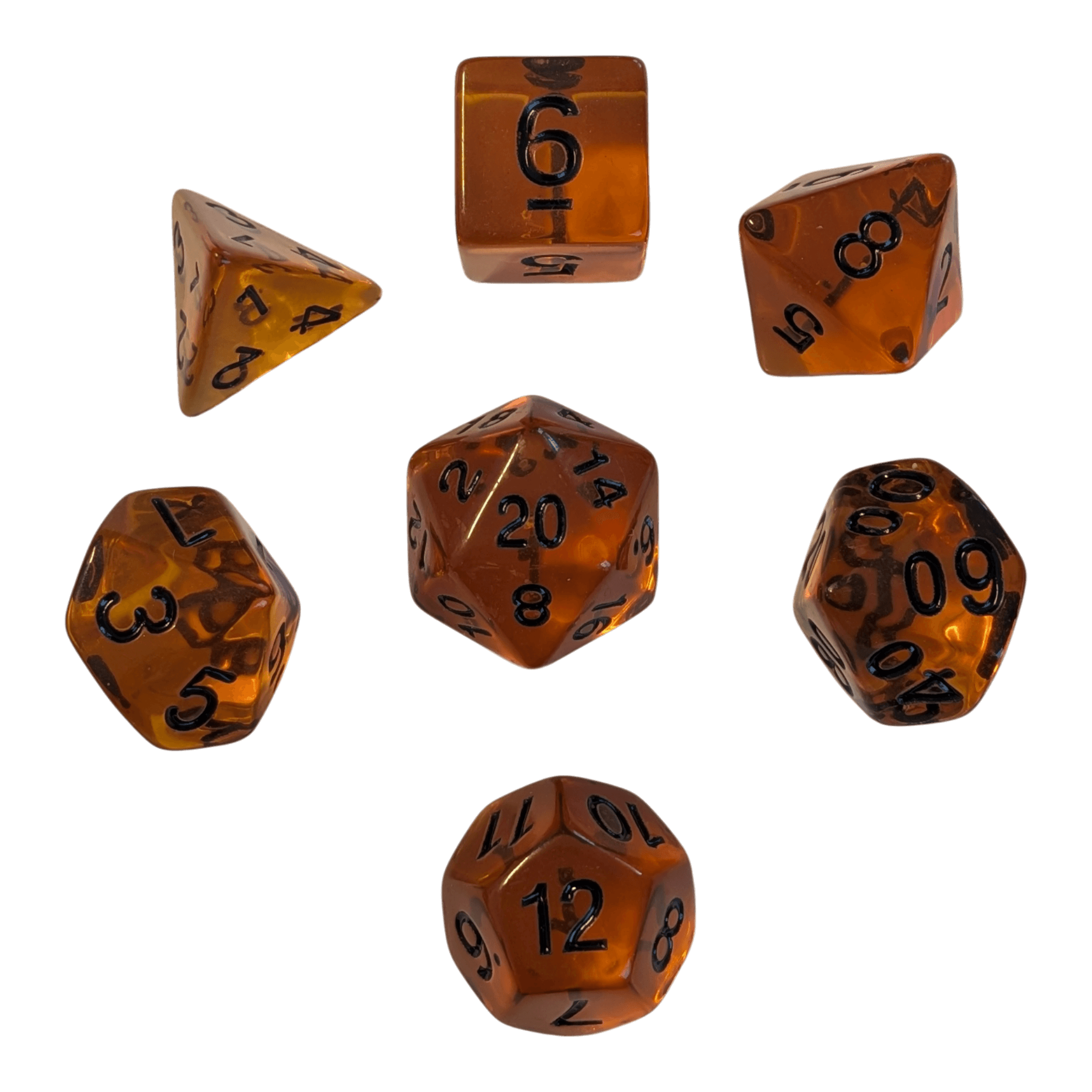 Die schwarzen Zahlen bilden einen klaren Kontrast zum transparenten Braun und sorgen für sehr gute Lesbarkeit bei jedem Wurf. Das 7er Set enthält alle klassischen Polywürfel für Pen-&-Paper-Rollenspiele, Tabletop und Fantasy-Abenteuer – ideal für Spielerinnen und Spieler, die ein dezentes, hochwertiges Design bevorzugen.
