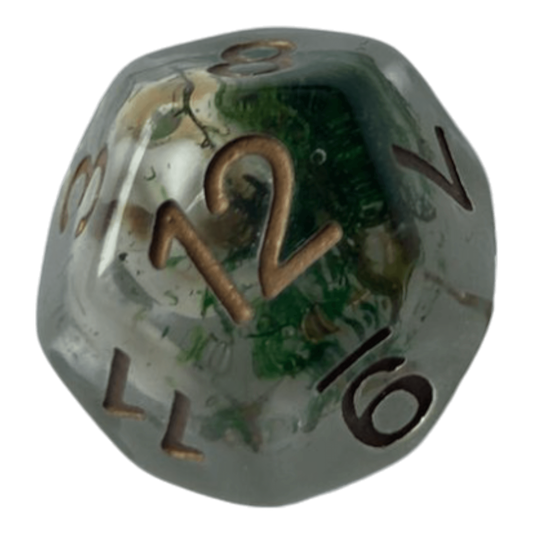Der W12 Transparente Würfel mit Totenkopf und grünem Moos bringt eine besondere, unheimliche Atmosphäre auf den Spieltisch. Im Inneren des transparenten Würfels sitzt ein detailreicher Totenkopf, umgeben von grünem Moos, das dem Würfel eine geheimnisvolle Tiefe verleiht. Die goldenen Nummern sorgen für eine stilvolle Lesbarkeit und setzen edle Akzente. Dieser transparente mehrfarbige Würfel ist ein echter Hingucker und bietet zugleich präzise Würfelergebnisse, die jedes Spiel bereichern.