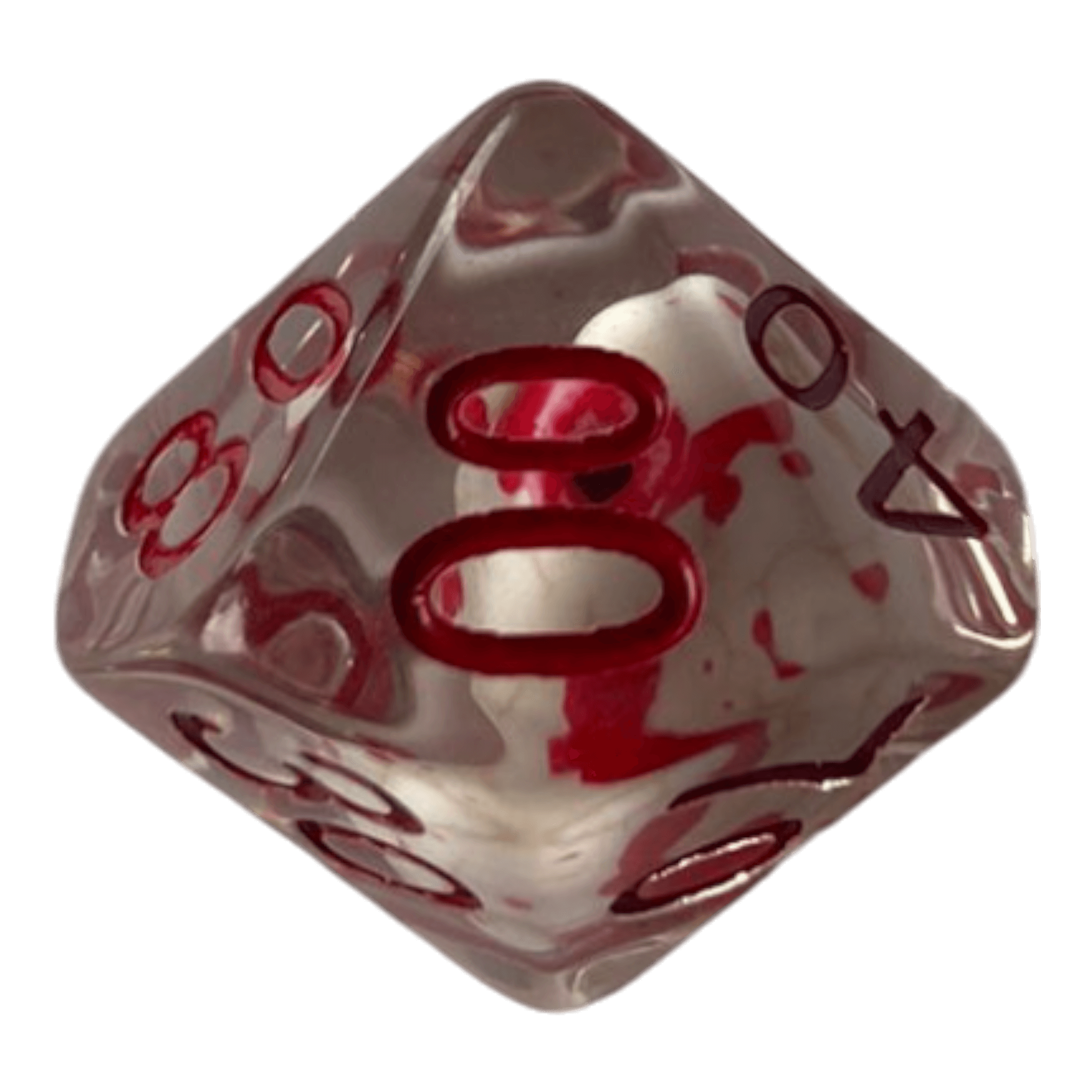W10-0 Transparenter Würfel mit Totenkopf und Bluttropfen – Gruselige Optik mit roten Nummern