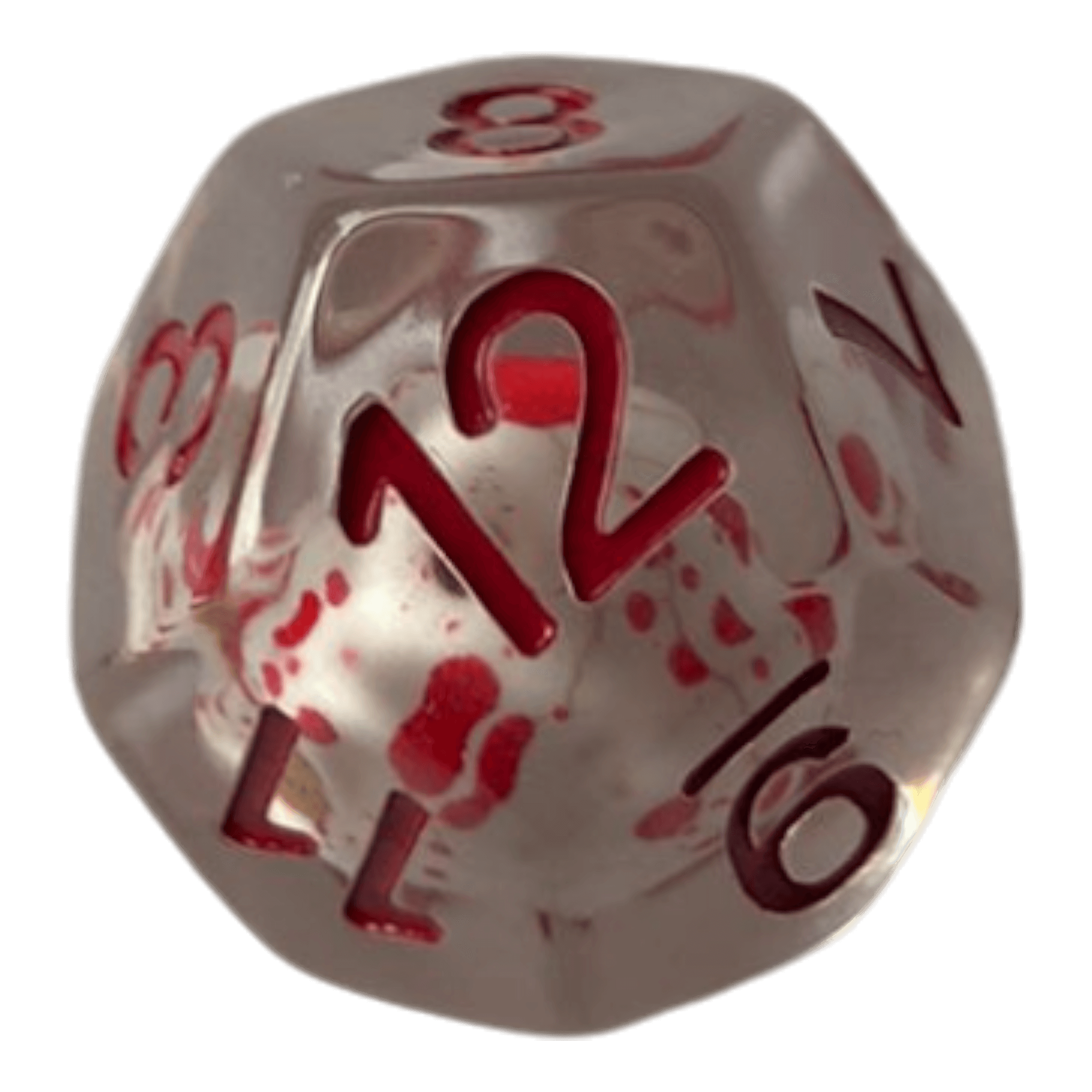 W12 Transparenter Würfel mit Totenkopf und Bluttropfen – Gruselige Optik mit roten Nummern