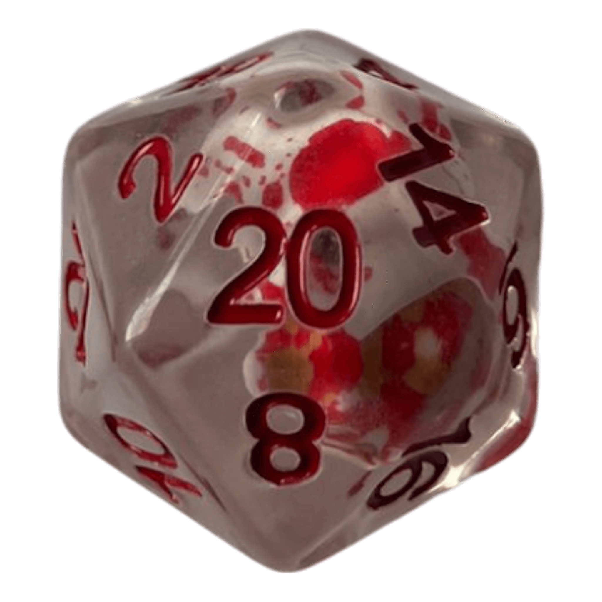 Der W20 Transparente Würfel mit Totenkopf und Bluttropfen bringt eine düstere und packende Stimmung in jedes Spiel. Im Inneren des transparenten Würfels befindet sich ein detailreich gestalteter Totenkopf, umgeben von Bluttropfen, die eine schaurige Tiefe und mystische Atmosphäre erzeugen. Die roten Nummern heben sich deutlich von der durchsichtigen Oberfläche ab und sorgen für eine klare Lesbarkeit, die perfekt zur unheimlichen Optik passt. Dieser transparente mehrfarbige Würfel ist nicht nur optisch beeindruckend, sondern auch ein verlässlicher Begleiter bei jedem Wurf.