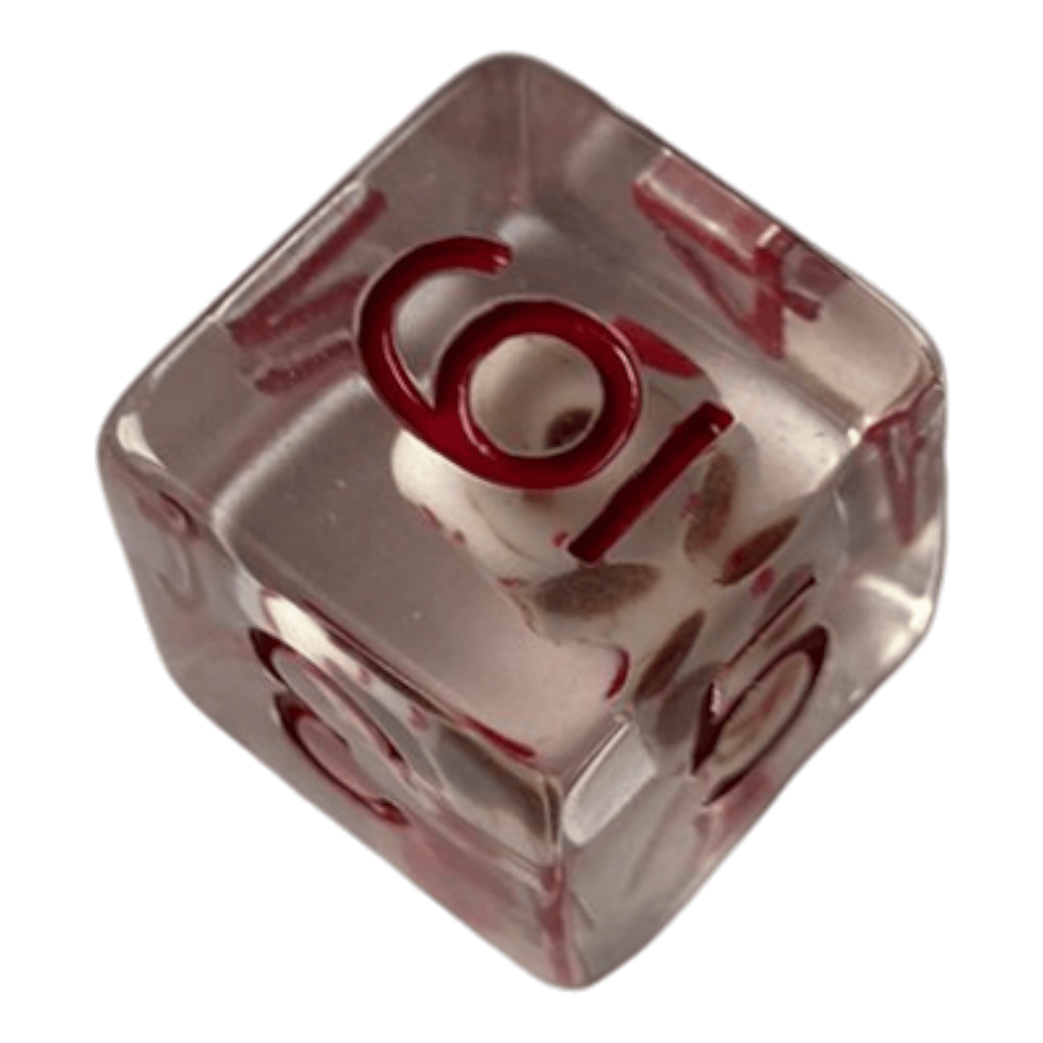 Der W6 Transparente Würfel mit Totenkopf und Bluttropfen verleiht deinem Spiel eine düstere und packende Atmosphäre. Im Inneren des transparenten Würfels befindet sich ein detailreicher Totenkopf, der von Bluttropfen umgeben ist, was dem Würfel eine fesselnde Tiefe und schaurige Optik verleiht. Die leuchtend roten Nummern stehen im starken Kontrast zur durchsichtigen Oberfläche und sorgen für eine beeindruckende Optik sowie eine klare Lesbarkeit. Dieser transparente mehrfarbige Würfel ist nicht nur ein Hingucker, sondern bringt auch eine besondere Stimmung in jede Spielrunde.