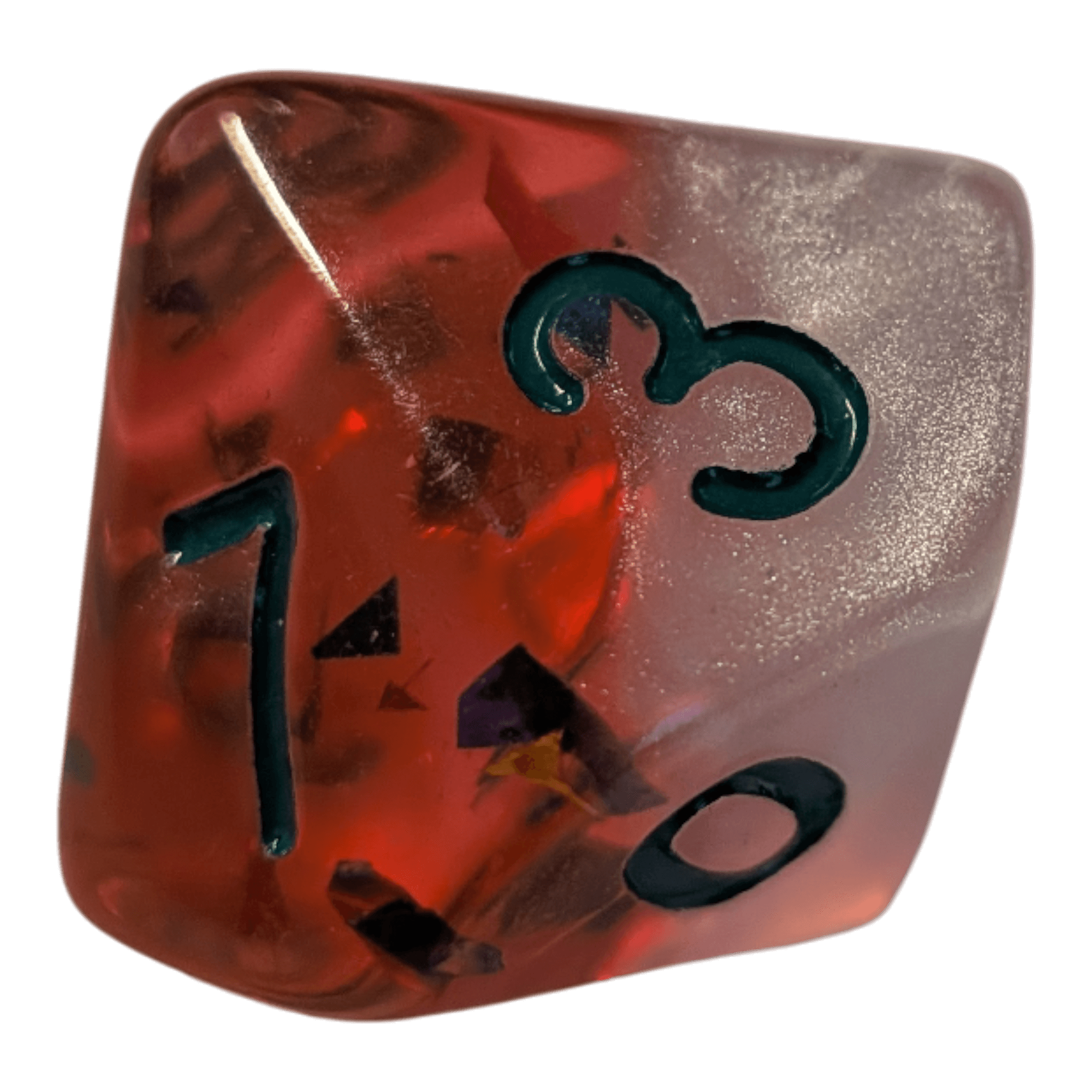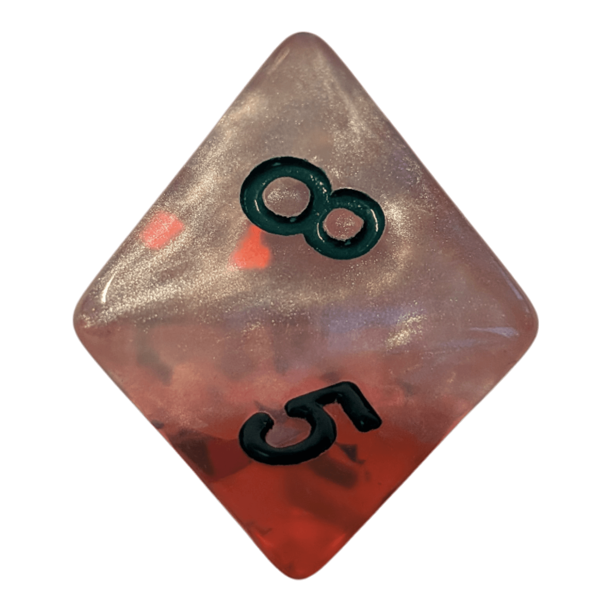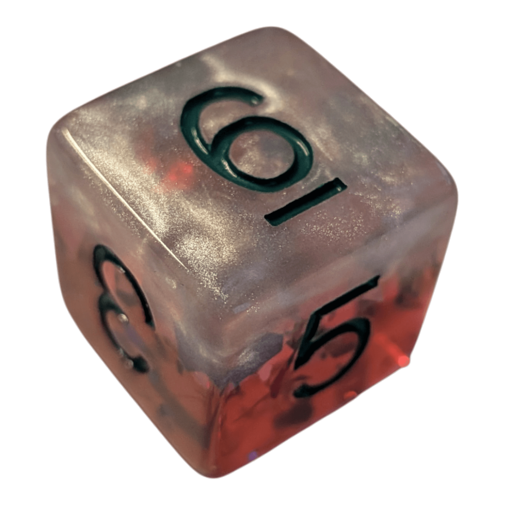Dieses edle Würfelset kombiniert transparentes Rot mit einem sanften Perlmutt-Weiß und feinen Glitter/Glitzer-Partikeln. Die schimmernde Optik sorgt für ein lebendiges Farbspiel, das je nach Lichteinfall elegant funkelt und jedem Wurf eine besondere Wirkung verleiht.