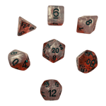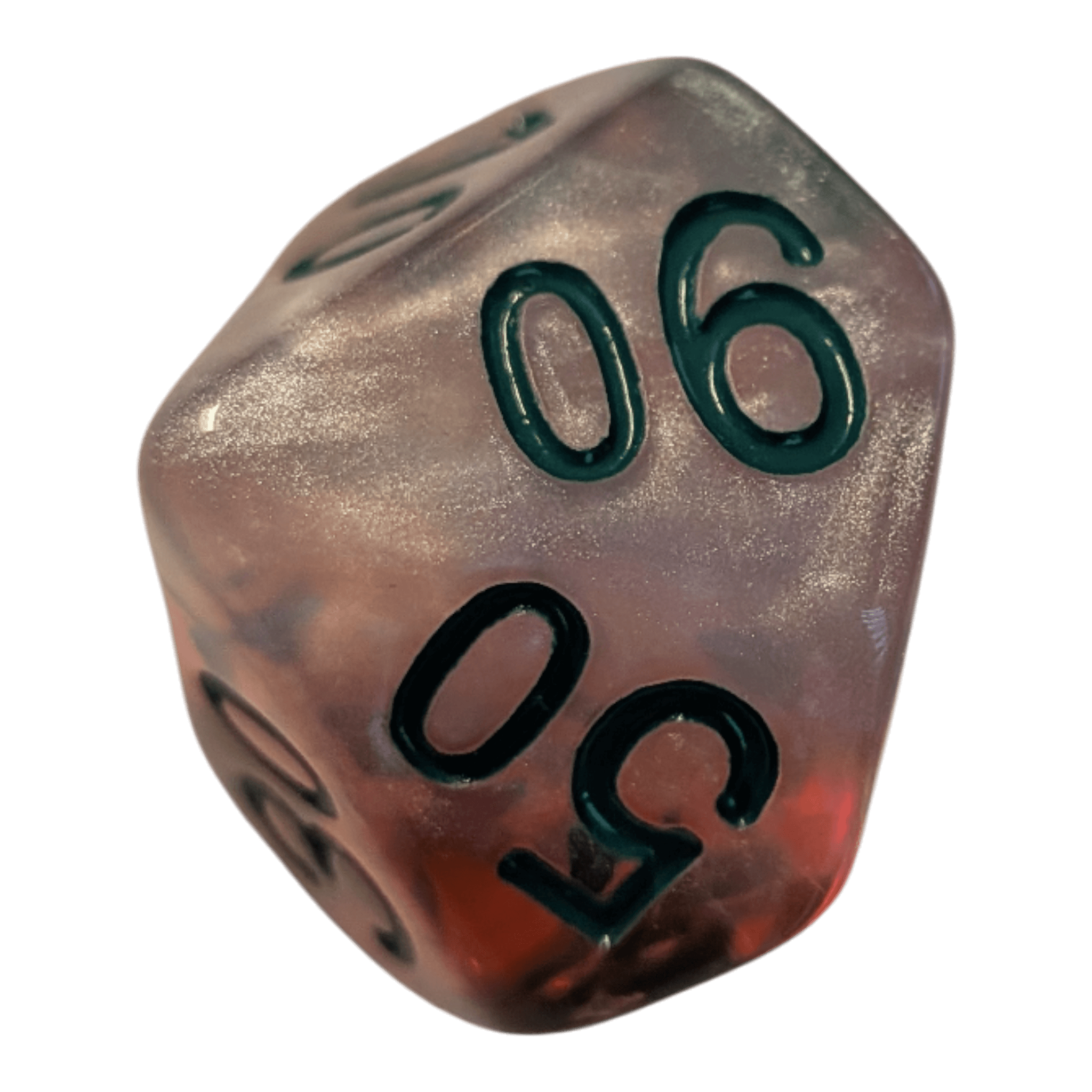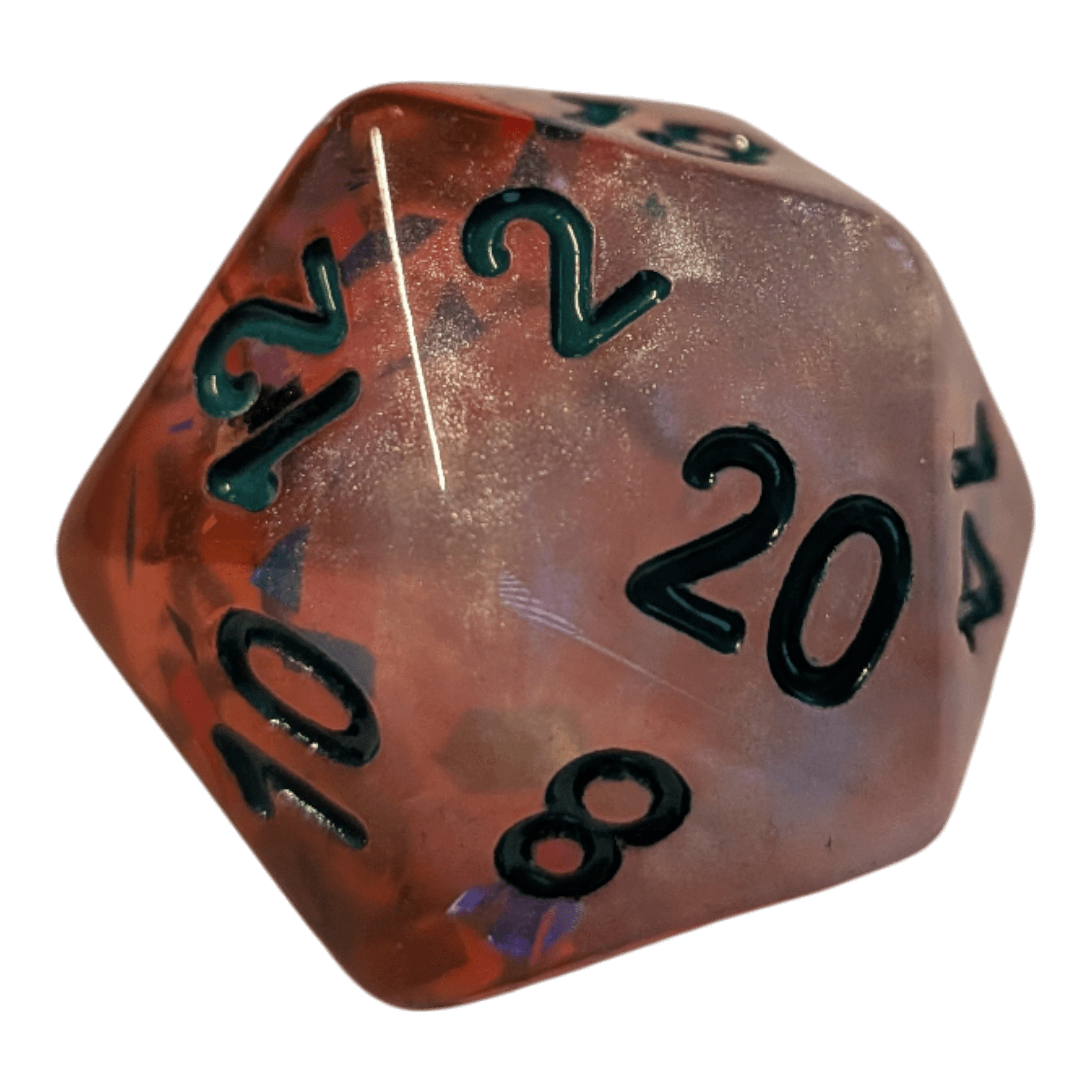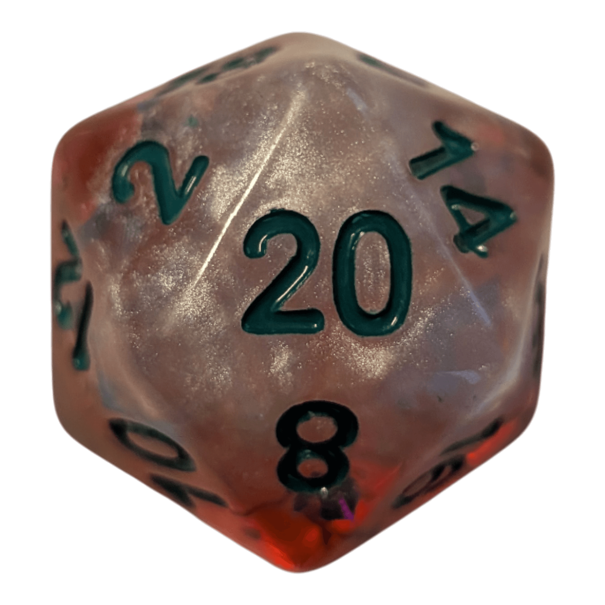 Dieses edle Würfelset kombiniert transparentes Rot mit einem sanften Perlmutt-Weiß und feinen Glitter/Glitzer-Partikeln. Die schimmernde Optik sorgt für ein lebendiges Farbspiel, das je nach Lichteinfall elegant funkelt und jedem Wurf eine besondere Wirkung verleiht.