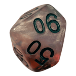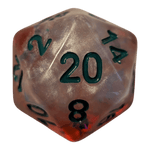Die grünen Zahlen setzen einen frischen Kontrast zur rot-weißen Grundfarbe und sind dabei klar und gut lesbar. Durch das transparente Material kommen Perlmutt-Effekt und Glitzer besonders gut zur Geltung – ideal für Spielerinnen und Spieler, die ein auffälliges, aber dennoch stilvolles Würfelset suchen.