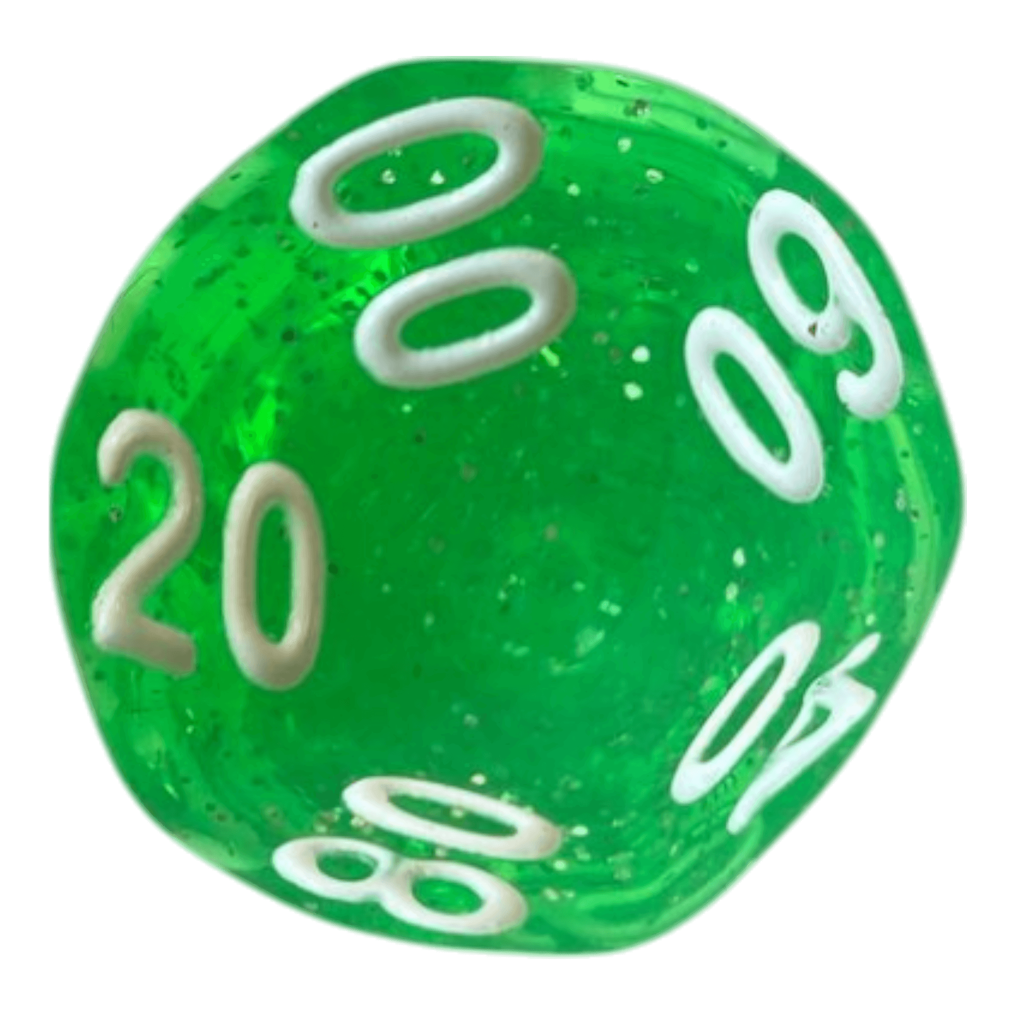 Dieser W10-0 Würfel in Grün beeindruckt mit seiner glitzernden Optik, die bei jeder Bewegung das Licht einfängt und für schimmernde Reflexe sorgt. Die weißen Zahlen in Zehnerschritten (10, 20, 30 usw.) stehen in klarem Kontrast zum funkelnden Hintergrund und gewährleisten eine gute Lesbarkeit.