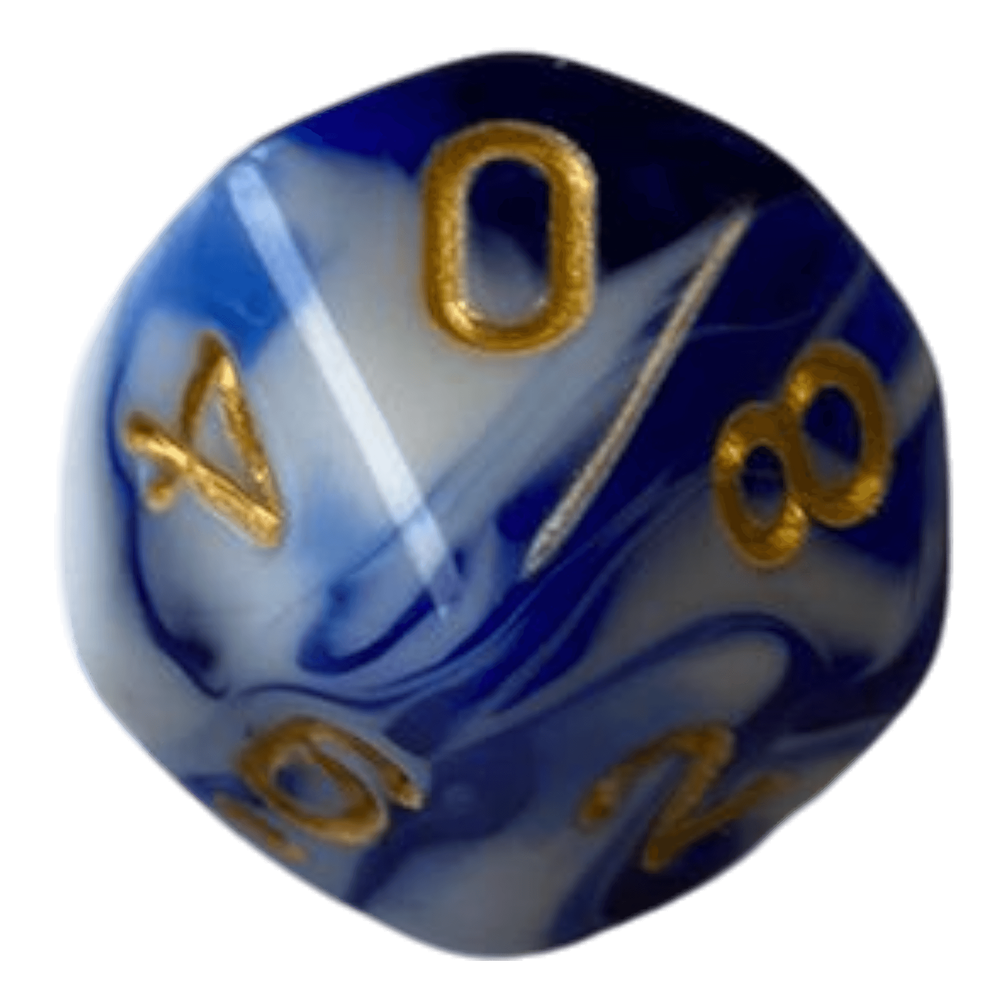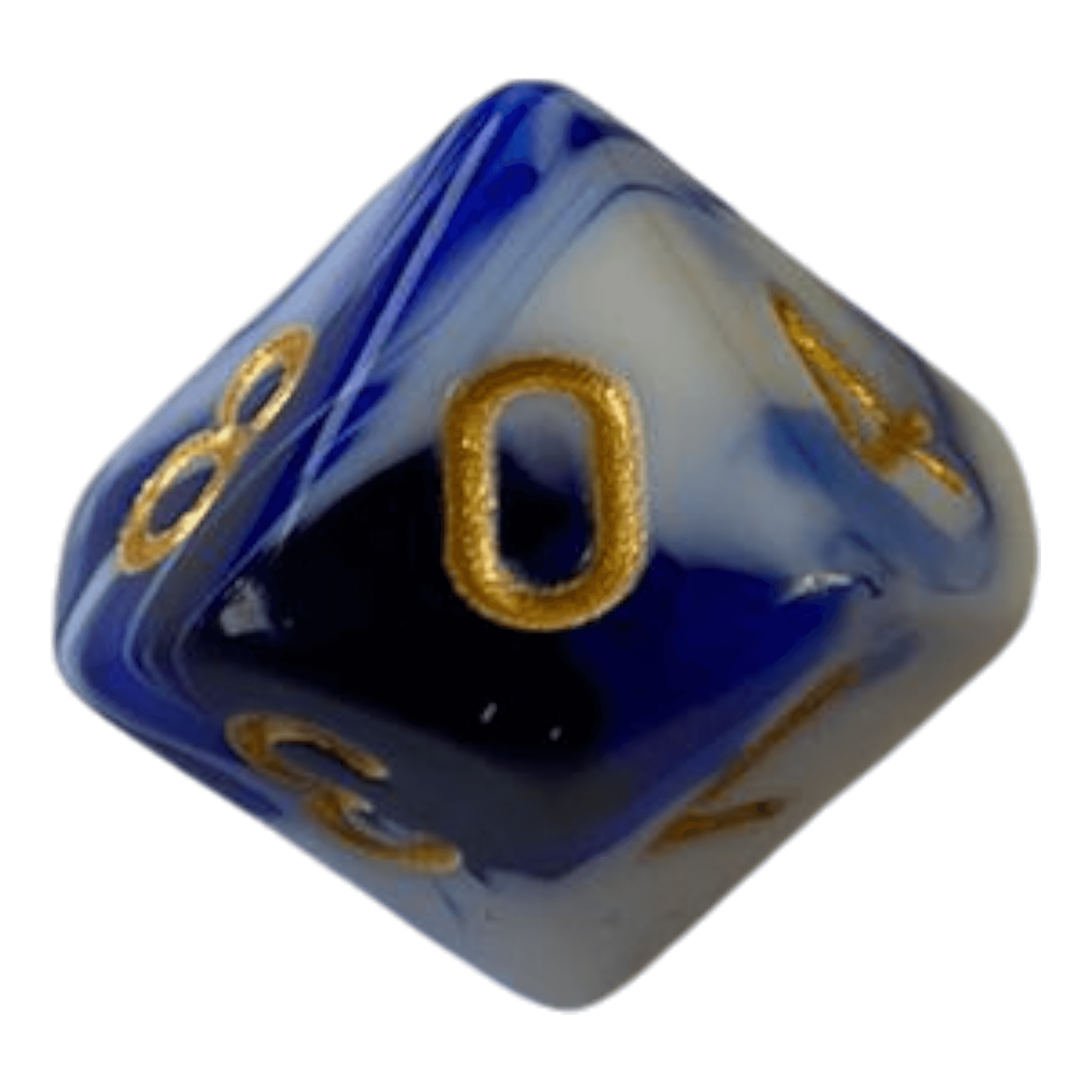 W10 Marmorierter Würfel Blau/Weiß – 16mm mit goldenen Zahlen