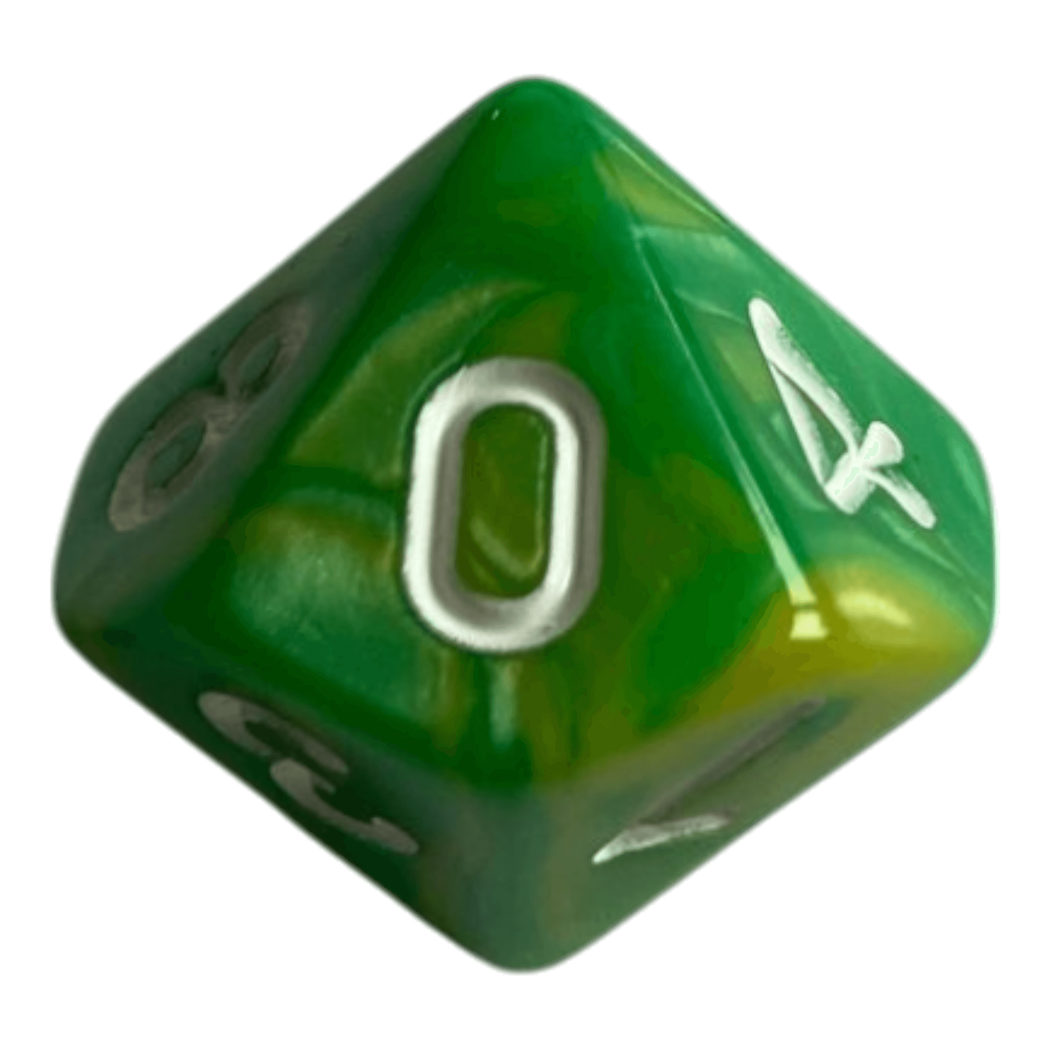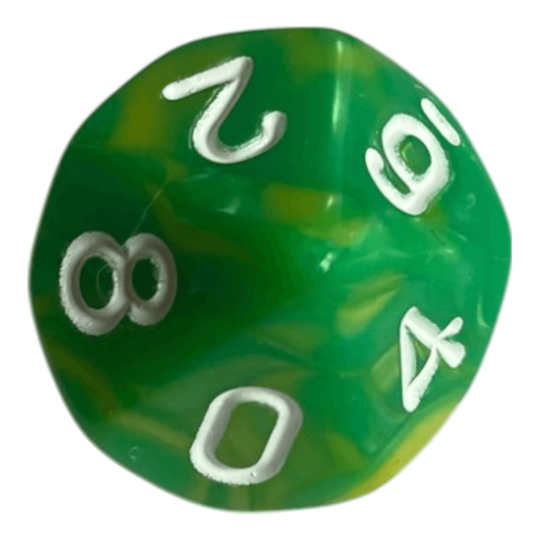 Dieser W10 Würfel in Gelb & Grün beeindruckt mit seiner einzigartigen Perlmutt-Optik, die das Licht in schimmernden Farbverläufen reflektiert. Die weißen Zahlen heben sich klar ab und ermöglichen eine schnelle Lesbarkeit – auch in hitzigen Spielsituationen.