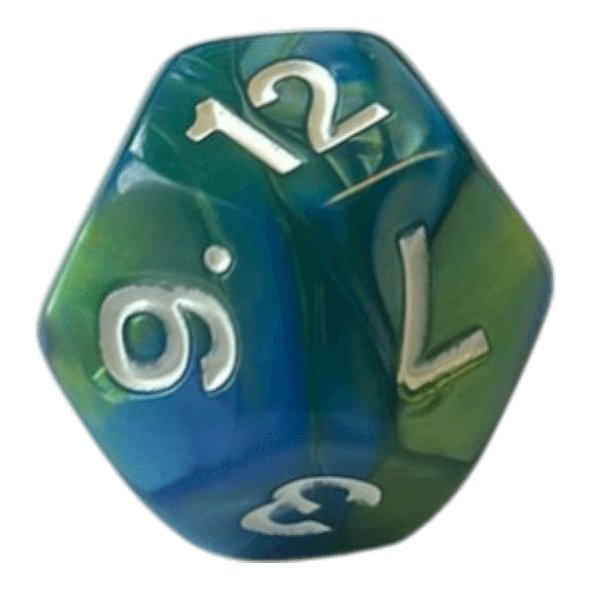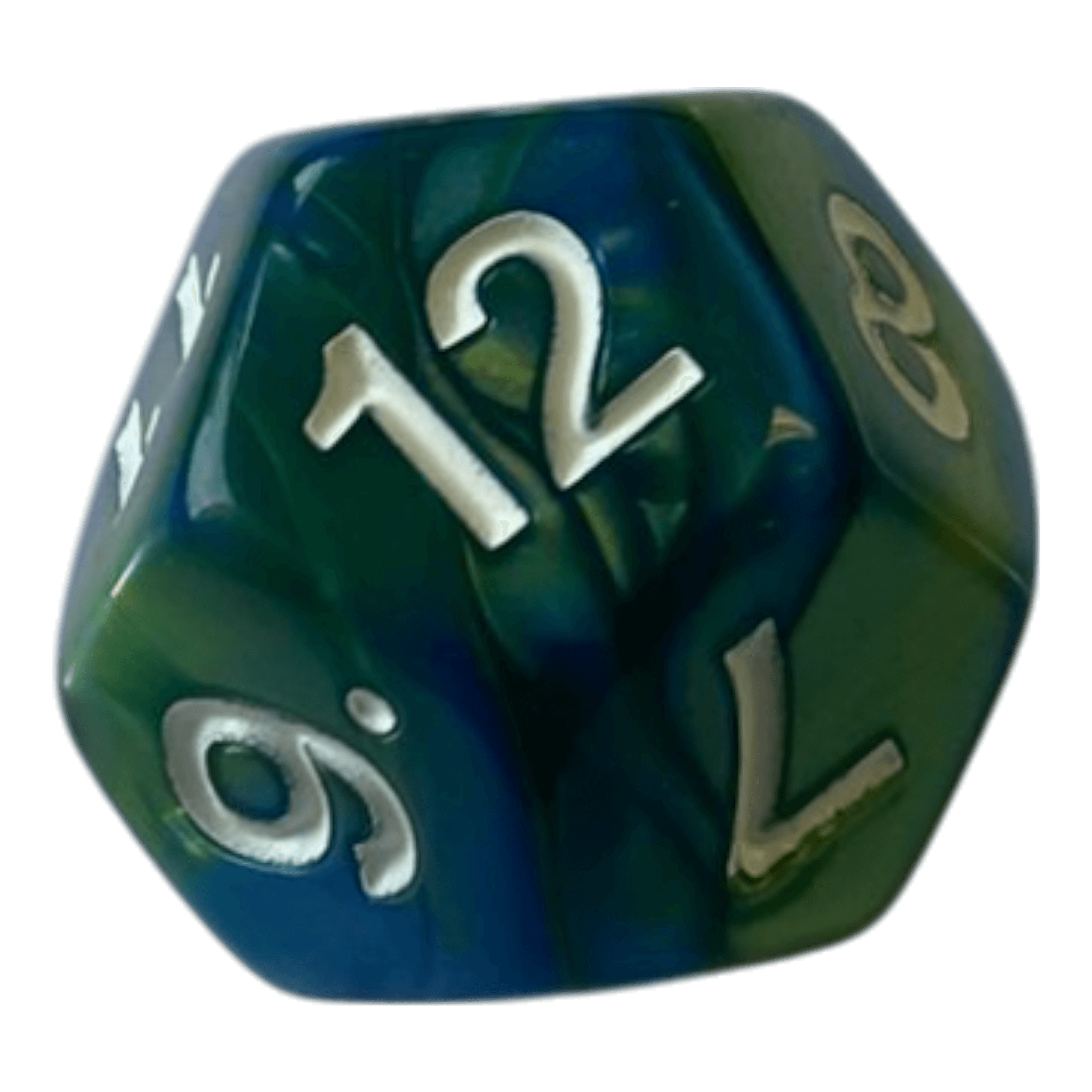 Der W12 Würfel aus der Blau & Grün Perlmutt Serie überzeugt mit seinem eindrucksvollen Perlmuttschimmer, der Blau- und Grüntöne in einem eleganten Farbspiel vereint. Die klaren weißen Zahlen heben sich deutlich von der Oberfläche ab und ermöglichen eine mühelose Lesbarkeit.