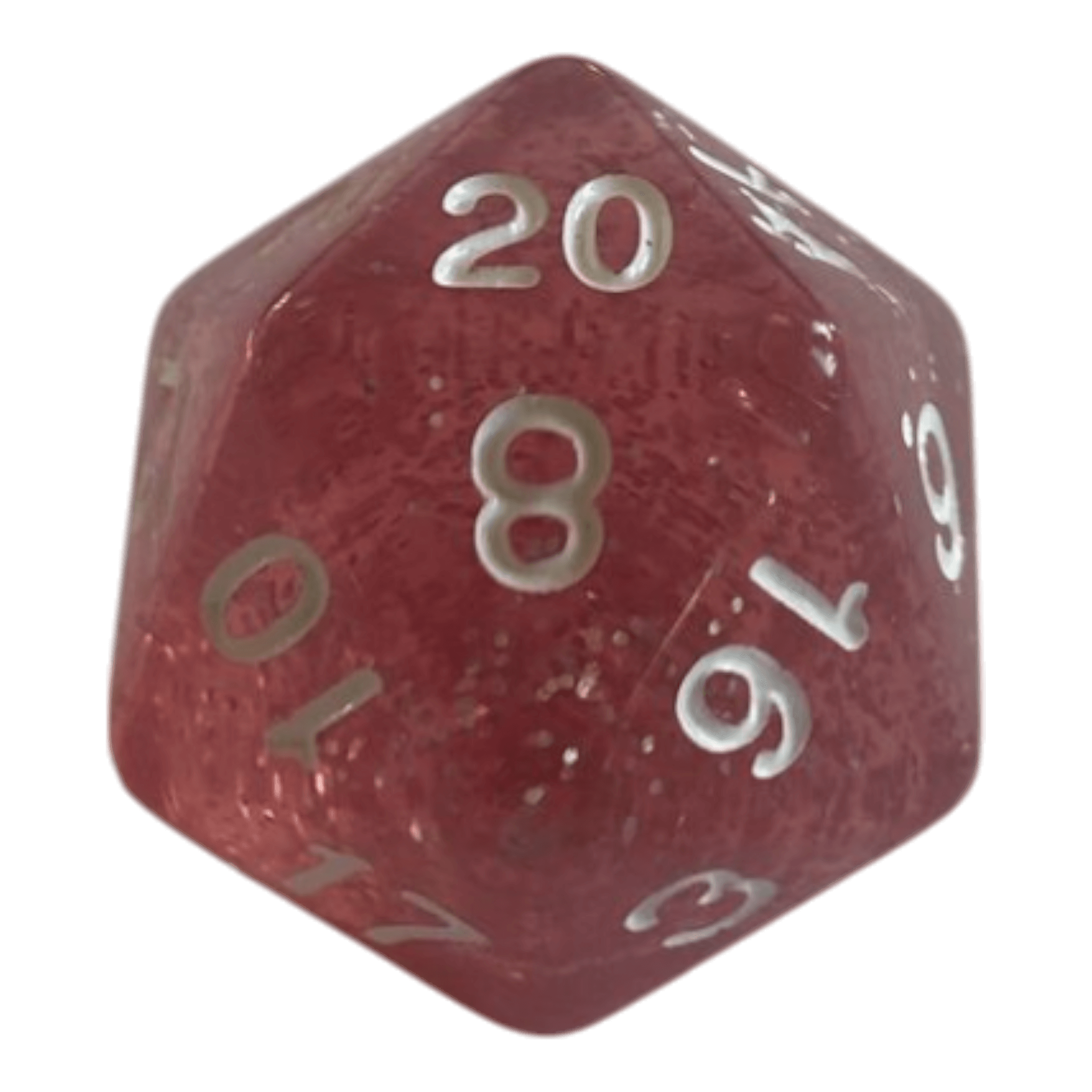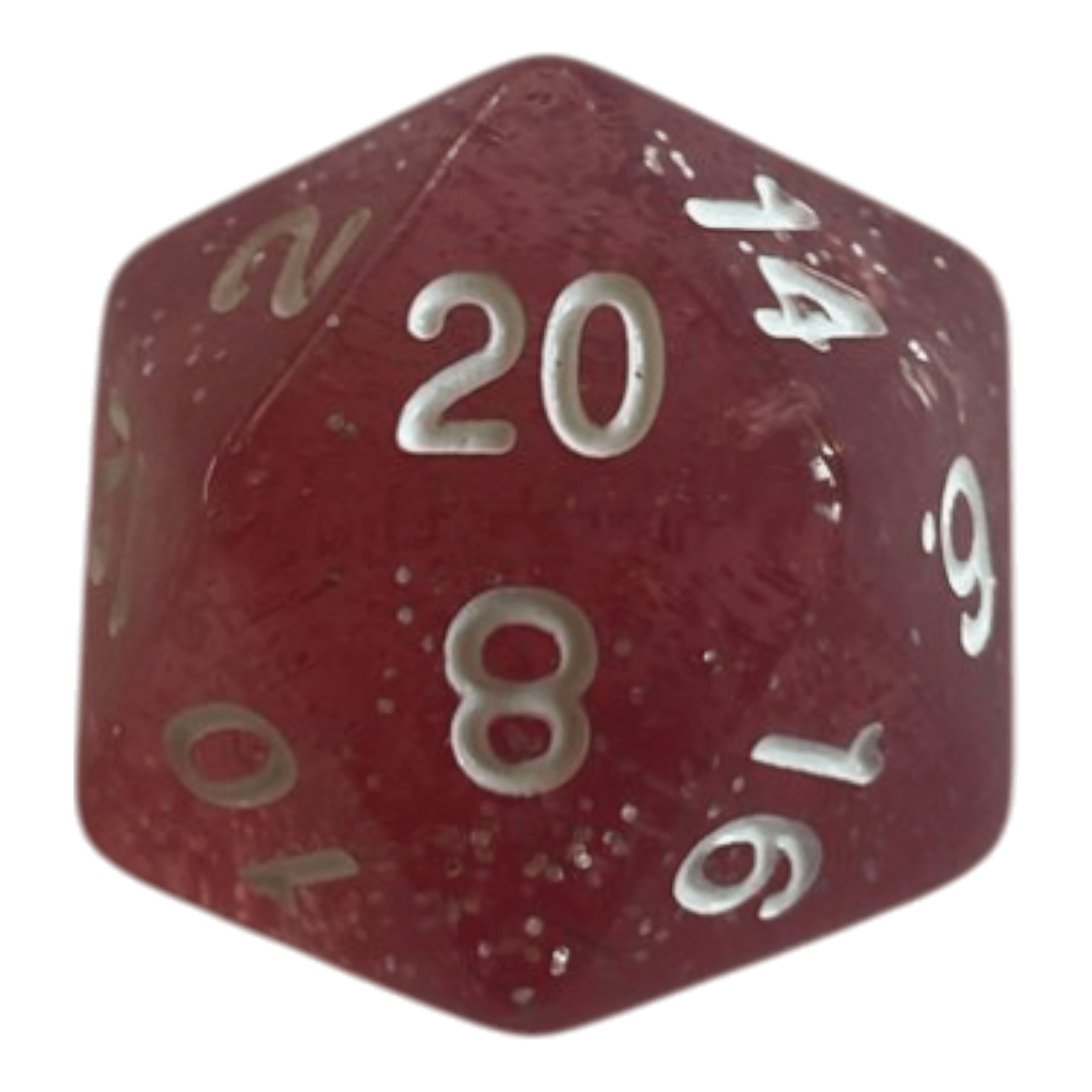 Dieser W20 Würfel in Pink besticht durch seine glitzernde Optik, die bei jeder Bewegung das Licht reflektiert und ein schimmerndes Farbspiel erzeugt. Die weißen Zahlen heben sich deutlich von der glitzernden Oberfläche ab und sorgen für eine ausgezeichnete Lesbarkeit – auch in spannenden Spielsituationen.