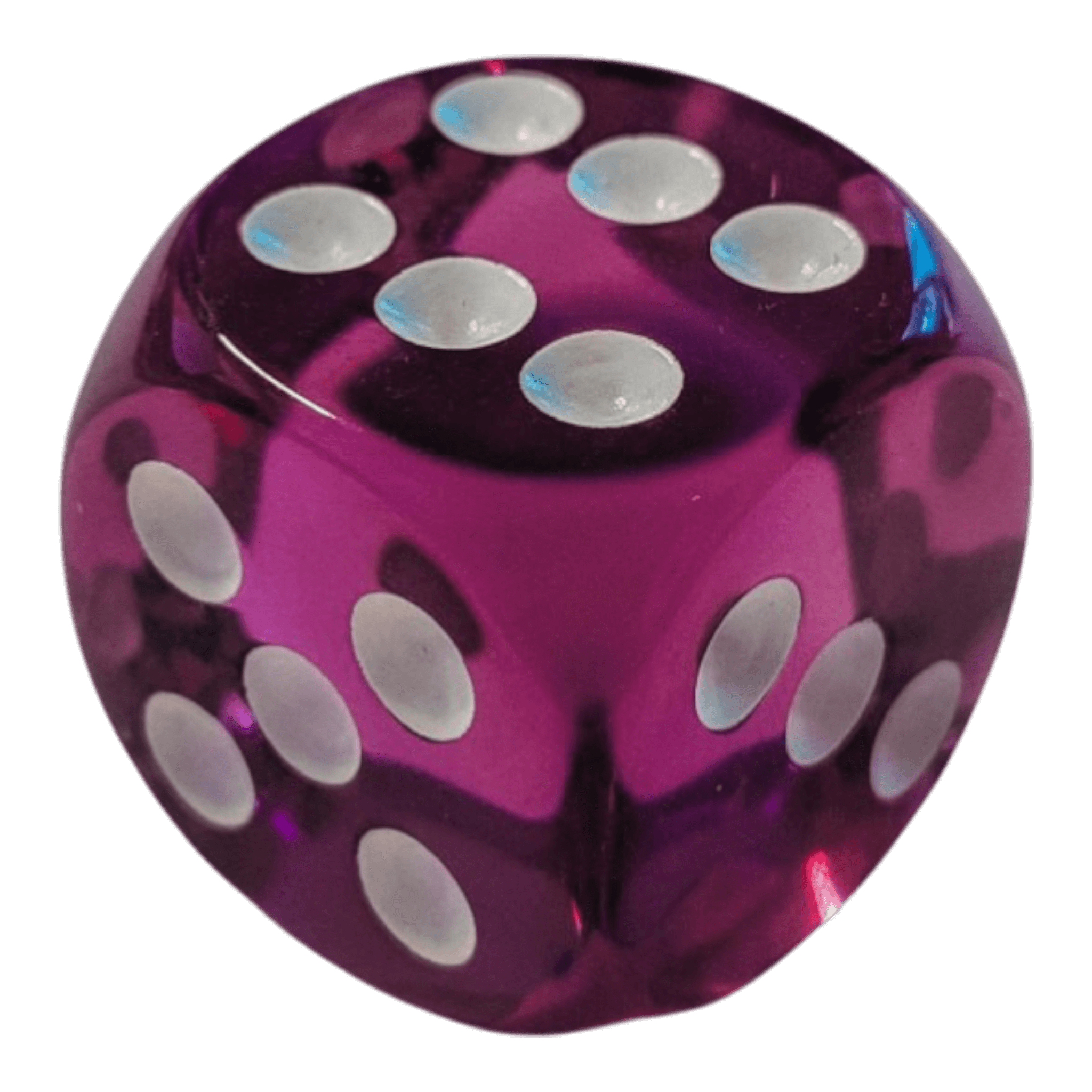 Dieser W6 Würfel überzeugt durch seine klare transparent-lila Optik und ein klassisches, gut lesbares Design. Das durchsichtige Material verleiht dem Würfel eine leichte, moderne Ausstrahlung, während die weißen Punkte einen starken Kontrast bieten und das Würfelergebnis sofort erkennbar machen.