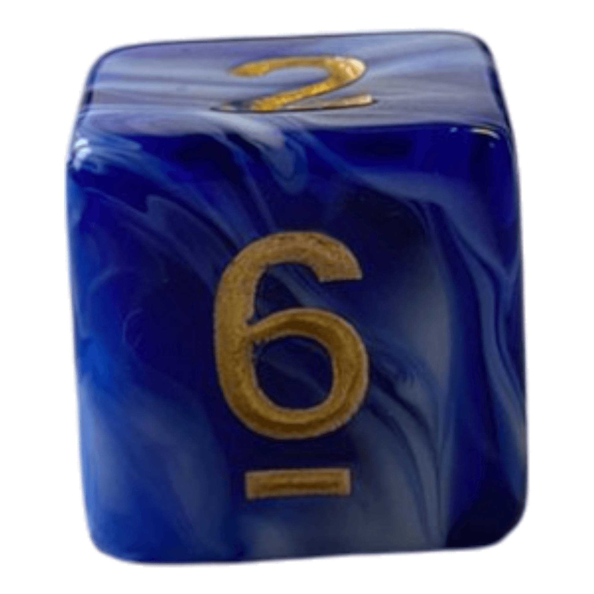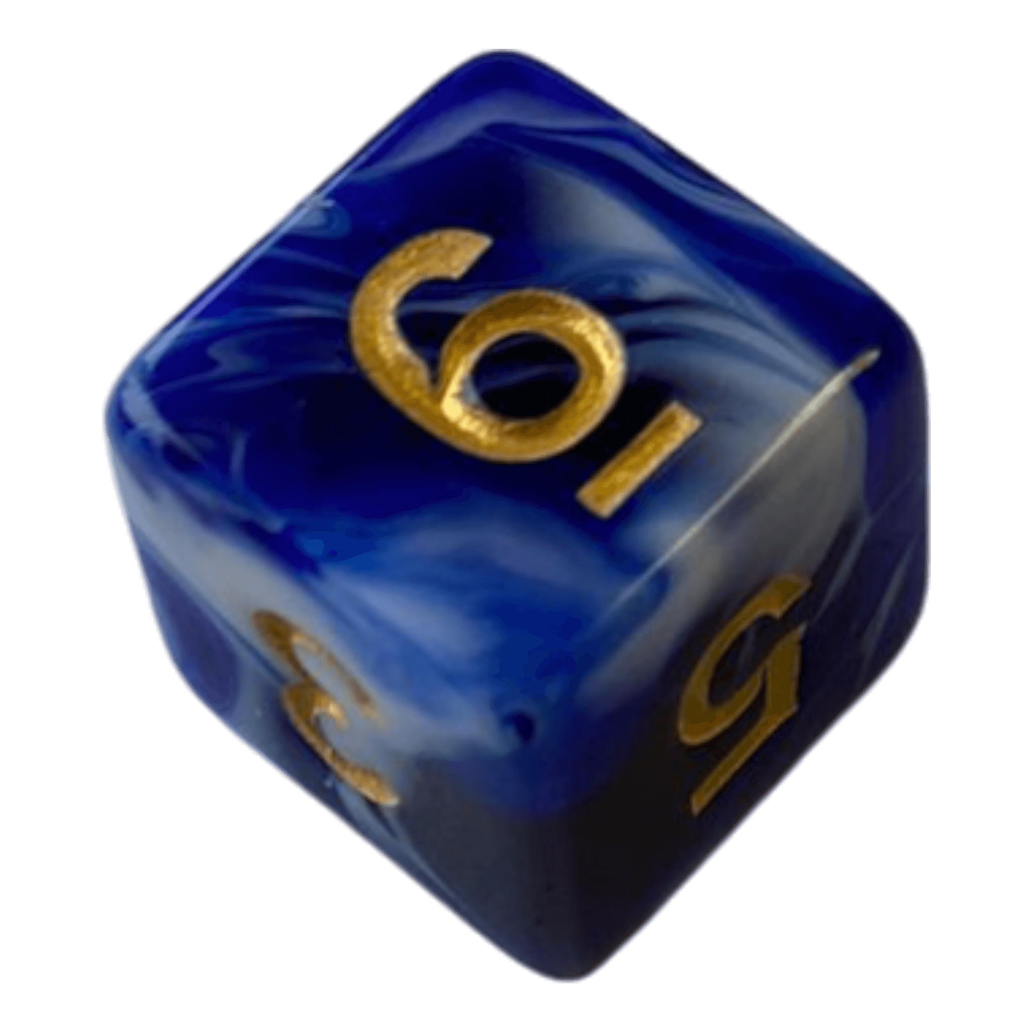 W6 Marmorierter Würfel Blau/Weiß – 16mm mit goldenen Zahlen