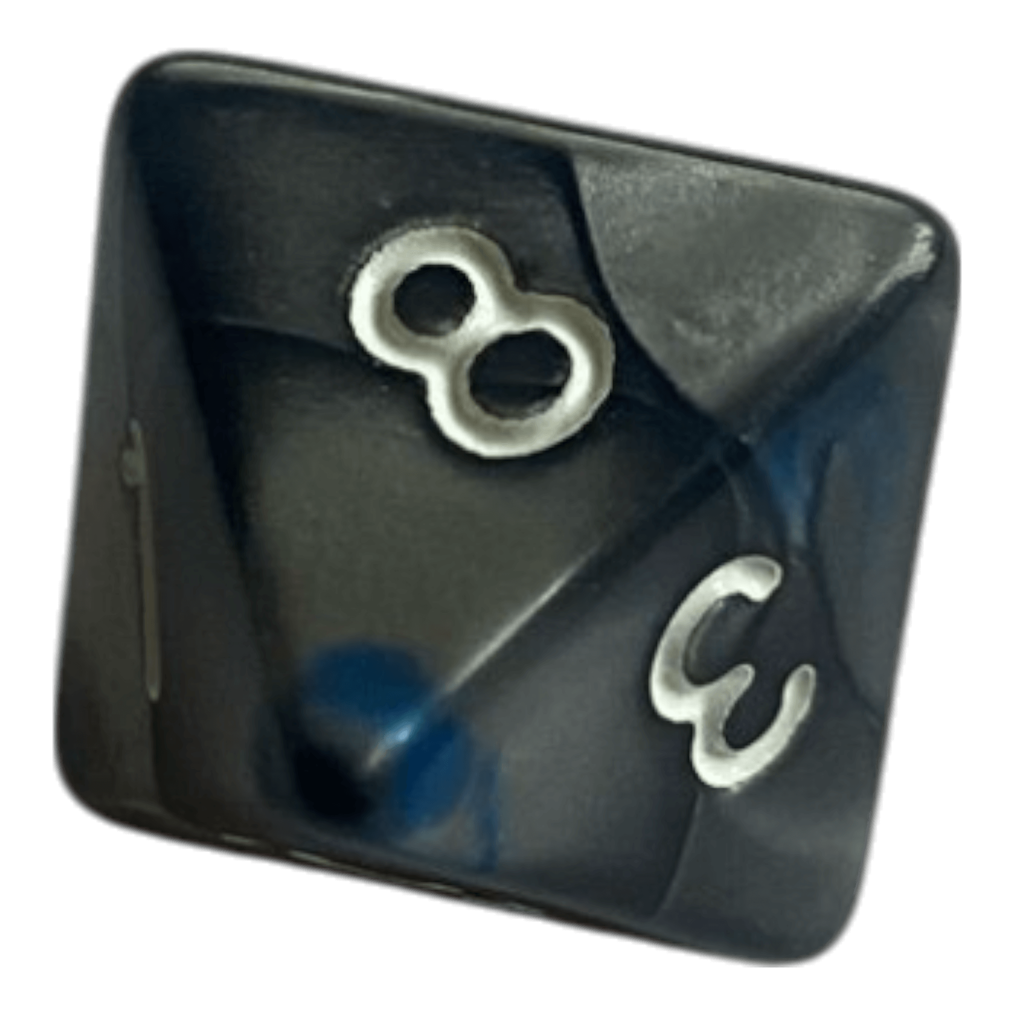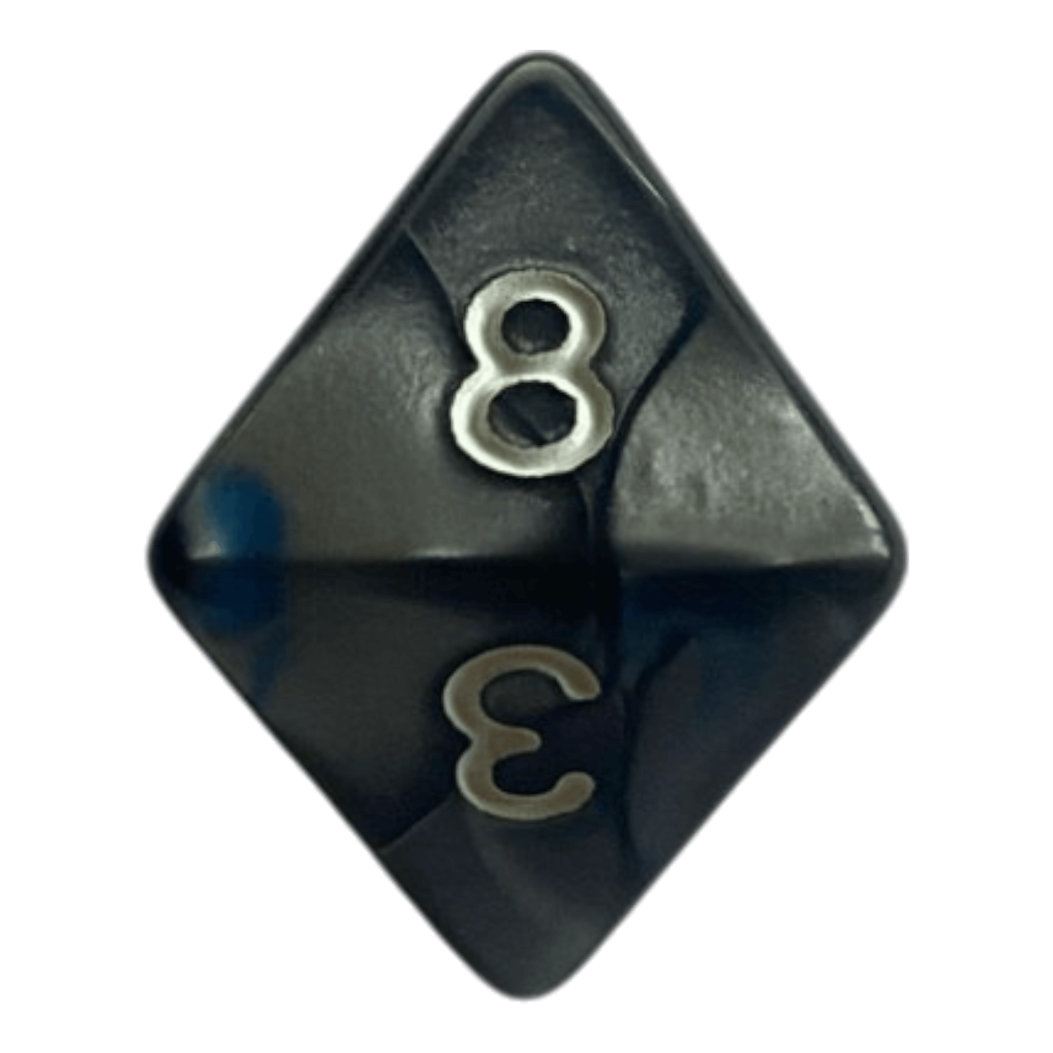 Dieser W8 Würfel in Blau und Grau überzeugt durch seine edle Perlmutt-Optik, die je nach Lichteinfall schimmernde Farbverläufe erzeugt. Die weißen Zahlen sorgen für eine klare Lesbarkeit und setzen einen frischen Kontrast zum dunklen Farbspiel.