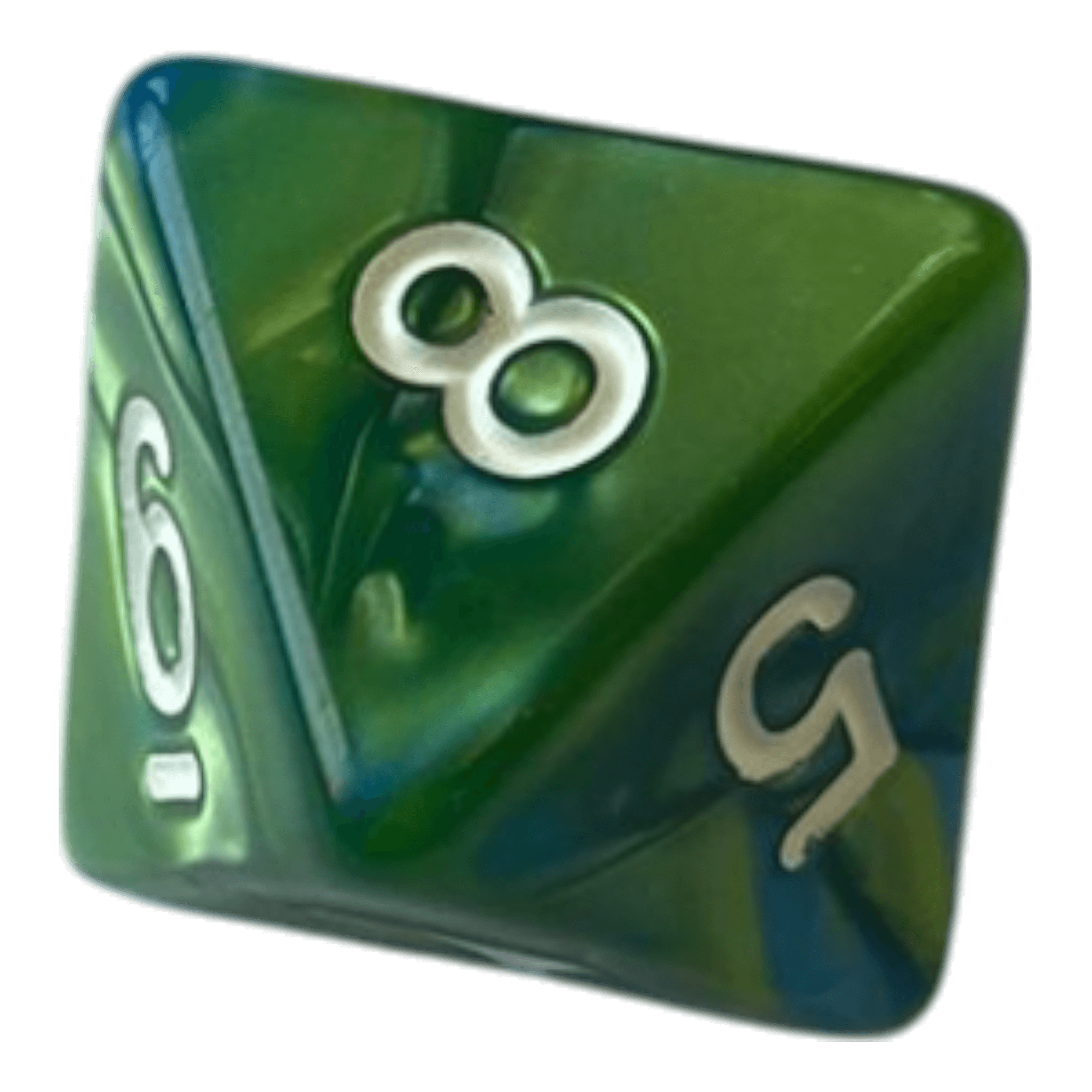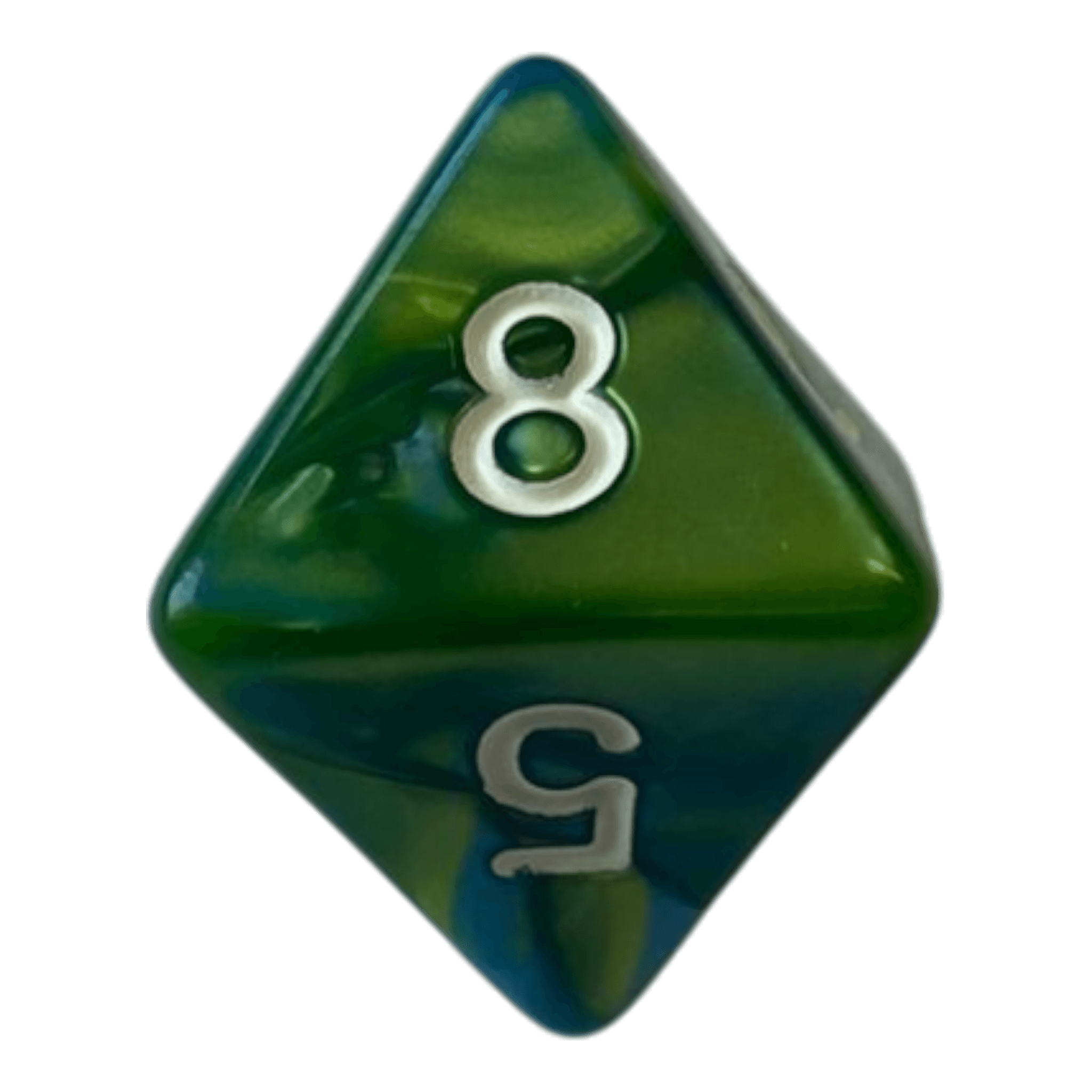 Der W8 Würfel aus der Blau & Grün Perlmutt Serie kombiniert ein faszinierendes Farbspiel in Blau und Grün mit einem eleganten Perlmuttschimmer. Die weißen Zahlen heben sich klar von der schimmernden Oberfläche ab und sorgen für eine ausgezeichnete Lesbarkeit, selbst in spannenden Spielsituationen.