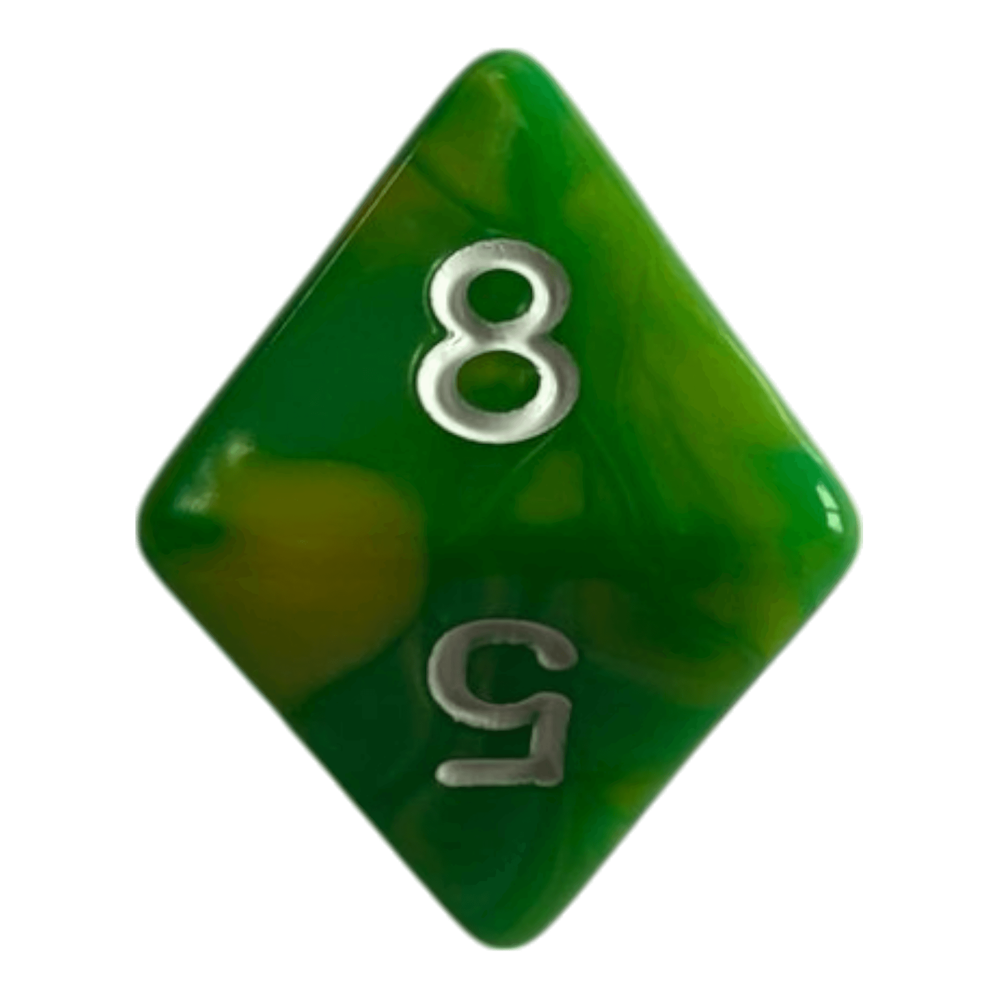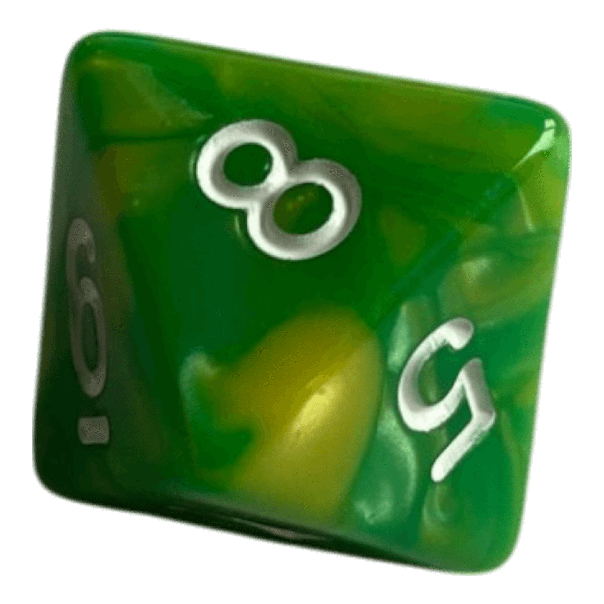 Dieser W8 Würfel in Gelb & Grün sorgt mit seiner schimmernden Perlmutt-Optik für lebendige Farbreflexe, die je nach Lichteinfall variieren. Die weißen Zahlen stehen im klaren Kontrast zu den leuchtenden Farben und gewährleisten eine gute Lesbarkeit.